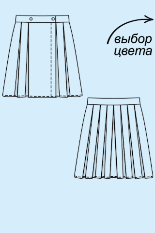 Юбка из поливискозной костюмной ткани, расширенная книзу; на притачном поясе; длиной выше колен. Переднее полотнище – застежка смещенная, на «запах» на две пуговицы; с четырьмя односторонними складками. Заднее полотнище – с одной бантовой складкой по центру, с шестью односторонними складками.